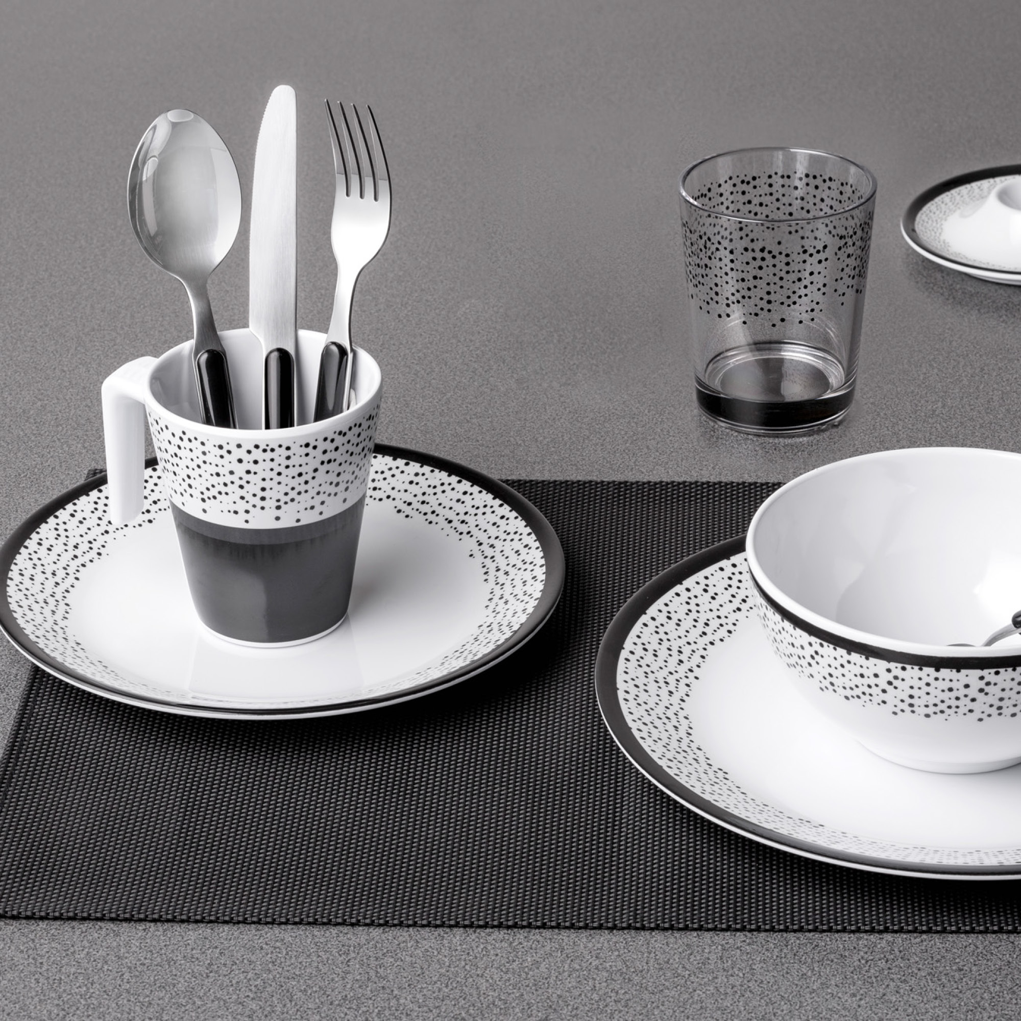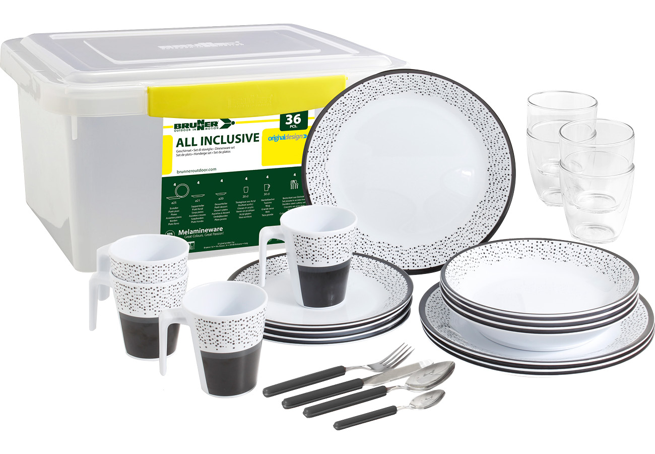 Melamine set (36 pieces) with transport box and the anti-slip system.