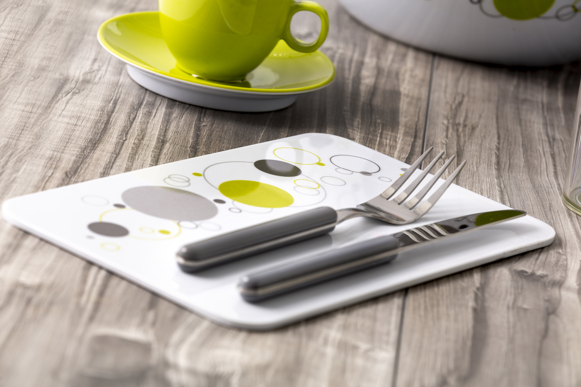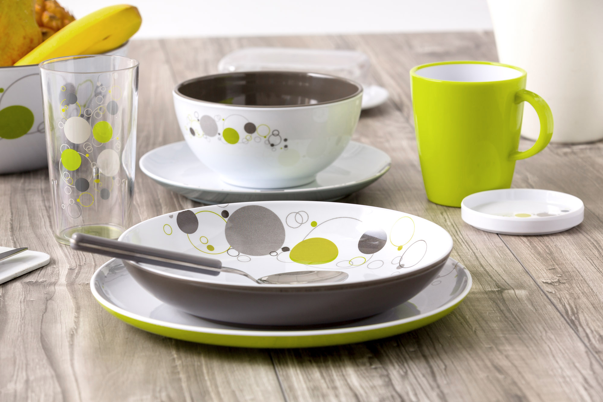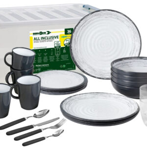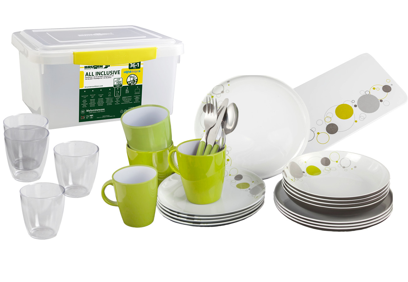 Melamine set (36 pieces) with transport box and the anti-slip system.