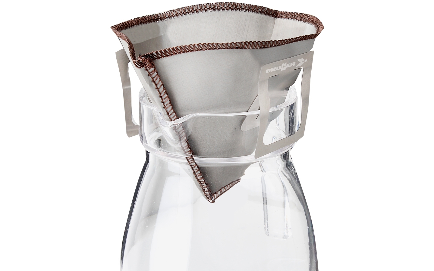Stainless steel pour-over coffee filter, extremely lightweight, foldable and easy to mount thanks to its flexible metal side clamps.