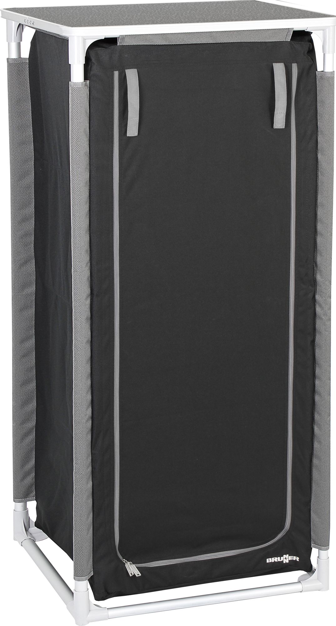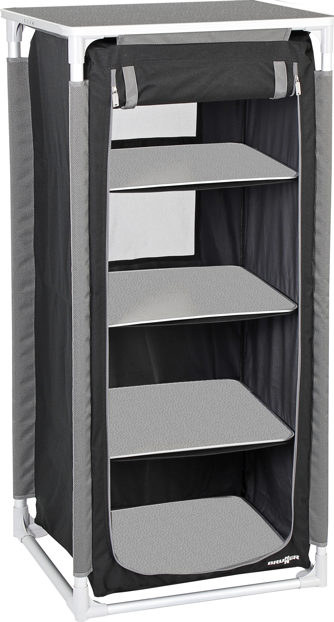 The Azabache CT Compact is a newly designed multipurpose camping kitchen cabinet featuring a robust aluminium frame. It offers two separate storage compartments and a durable aluminium worktop with an integrated spirit level for precise setup.
