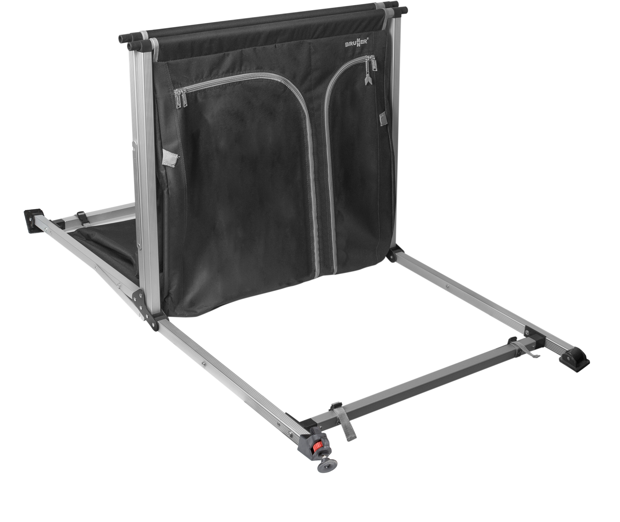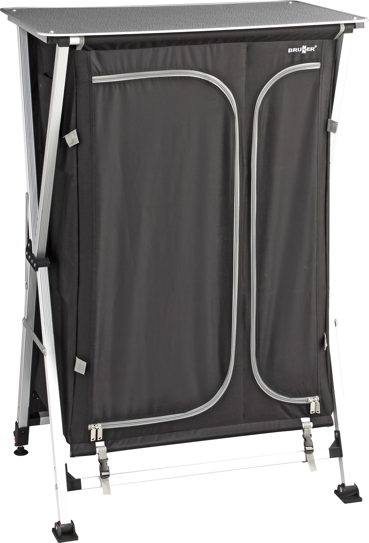 The Azabache CT Cross Compact is a newly designed multipurpose camping kitchen cabinet featuring a robust aluminium CROSS frame. One leg is height-adjustable and swivels, equipped with a large foot to prevent sinking on soft ground. It offers two separate storage compartments and a durable aluminium worktop with an integrated spirit level for precise setup.