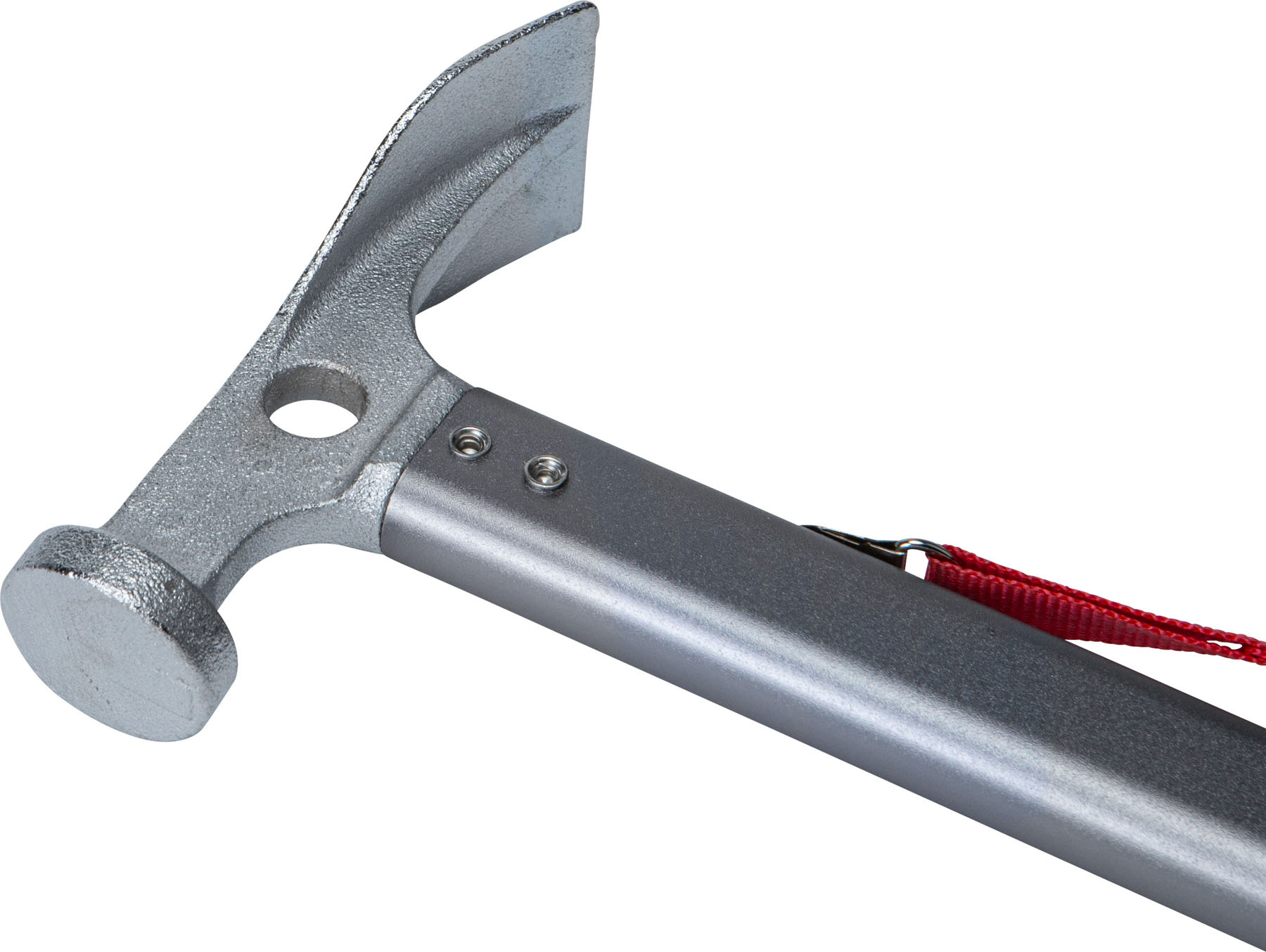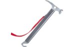 Multi-purpose camping mallet made entirely of metal with solid 2-piece hammer/pick head, practical peg hook and safety hand strap.