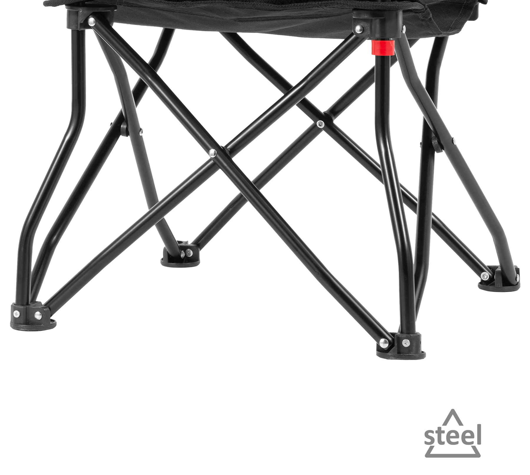 Folding chair with special patented frame that ensures that it does not tip over. Made of coated steel frame and seat in resistant polyester fabric. Very easy to open and close. Complete with carry bag.