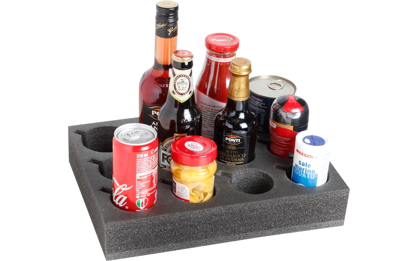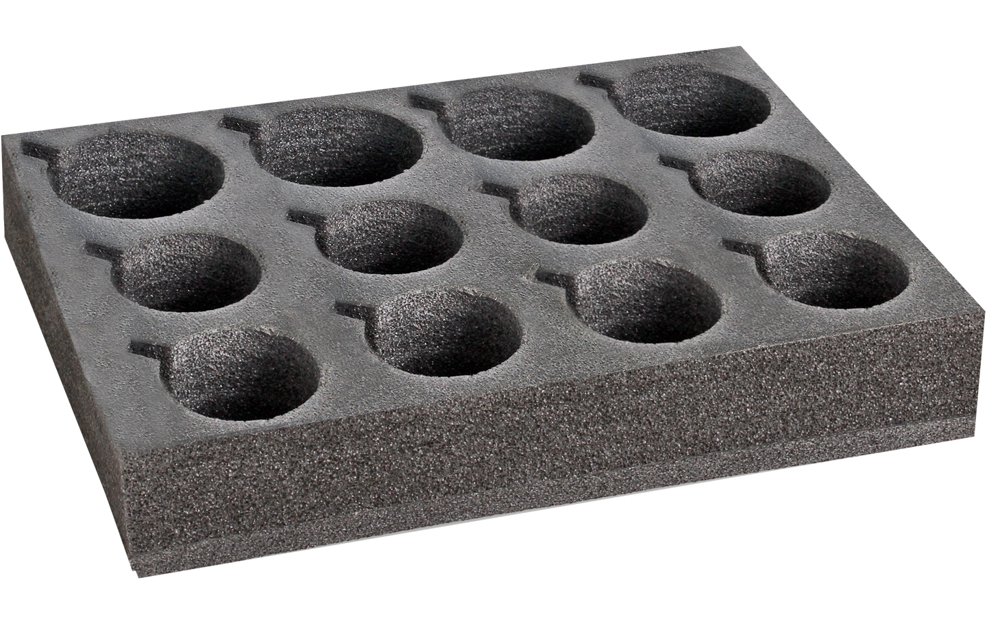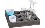Glass and cupholder made from soft foamed plastic. Holds up to 12 glasses/cups of different sizes. With handle recess.