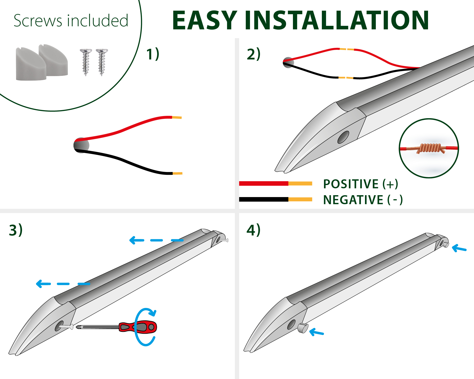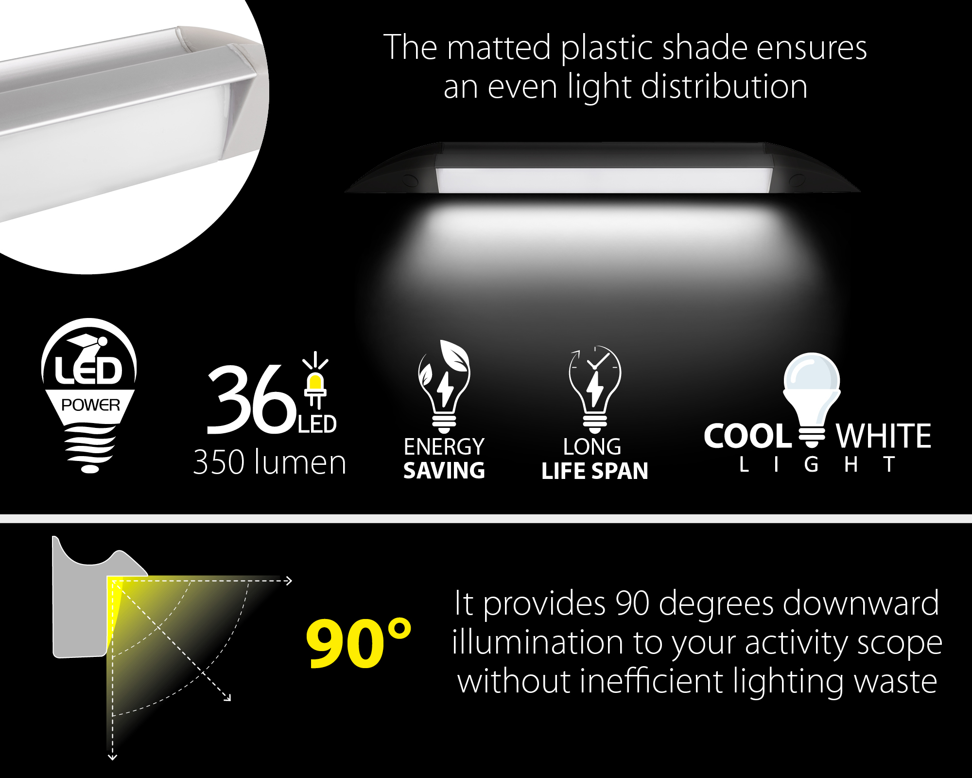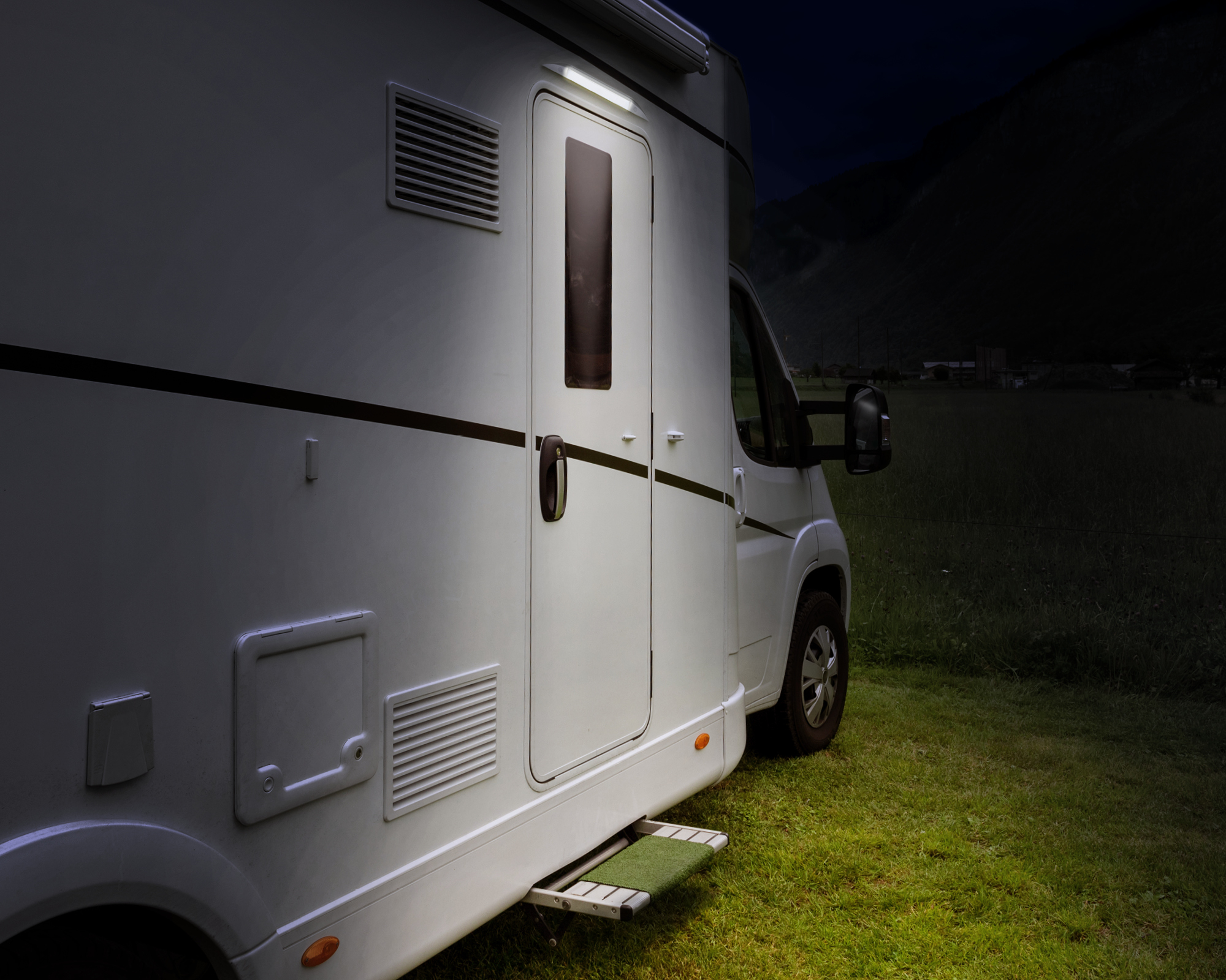 LED exterior light for illuminating the entrance area of recreational vehicles. The special shape of the aluminium housing facilitates rainwater run-off. The matted plastic shade ensures an even light distribution. Available in 2 lengths.