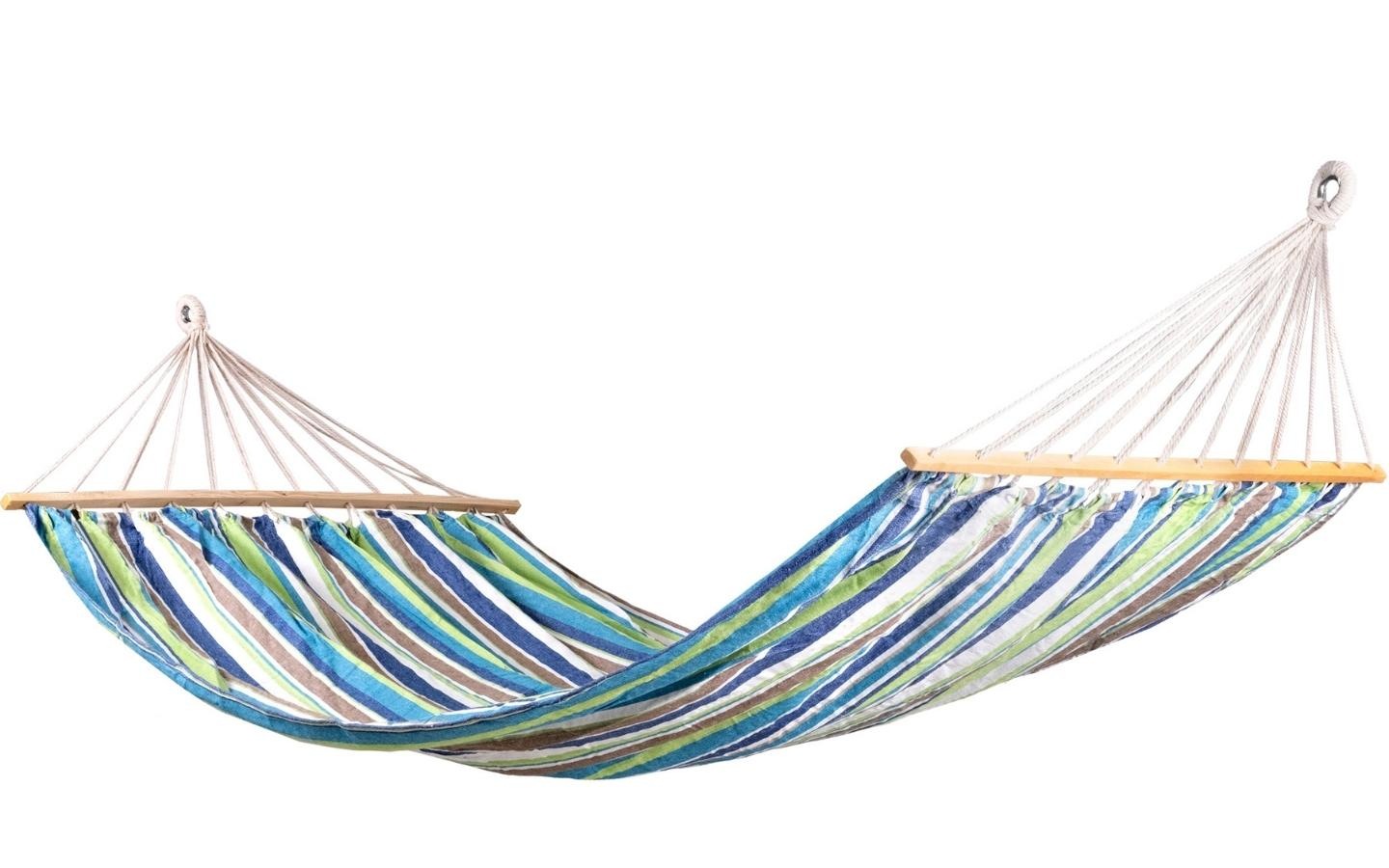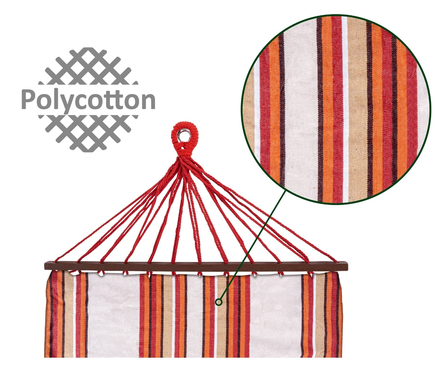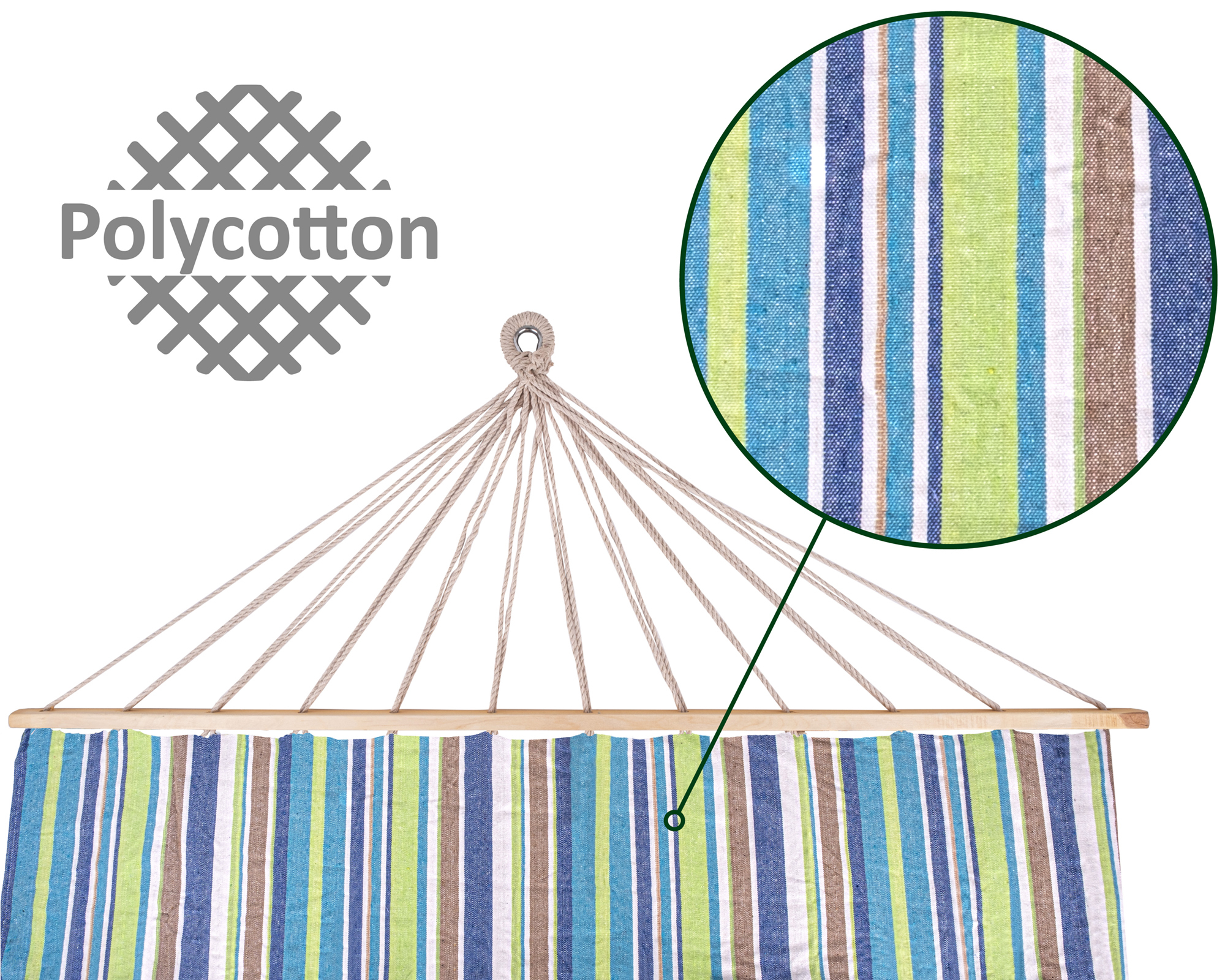 Comfortable hammock with wood spreader bar, which prevents the fold-back of the hammock fabric.