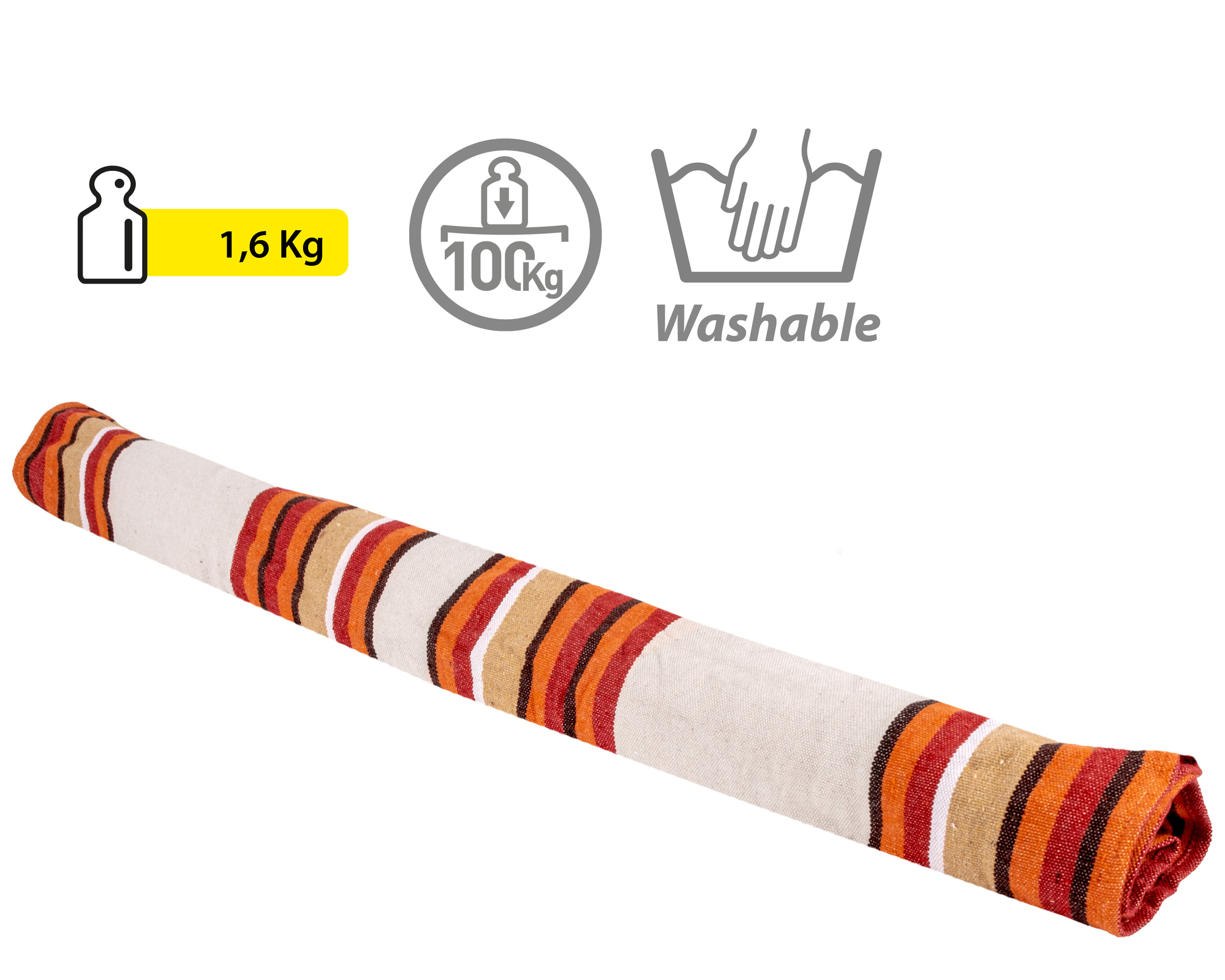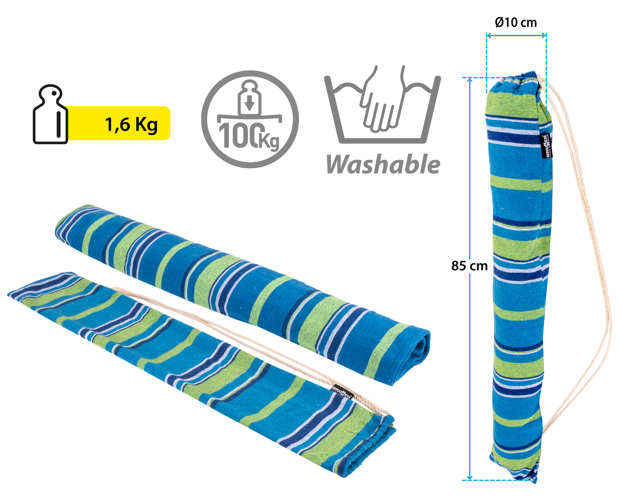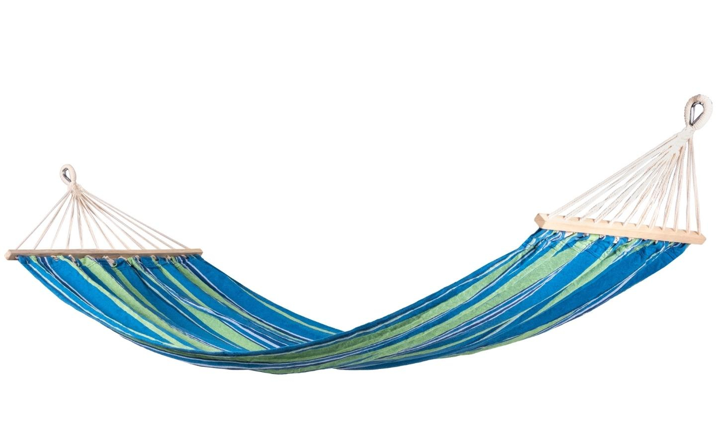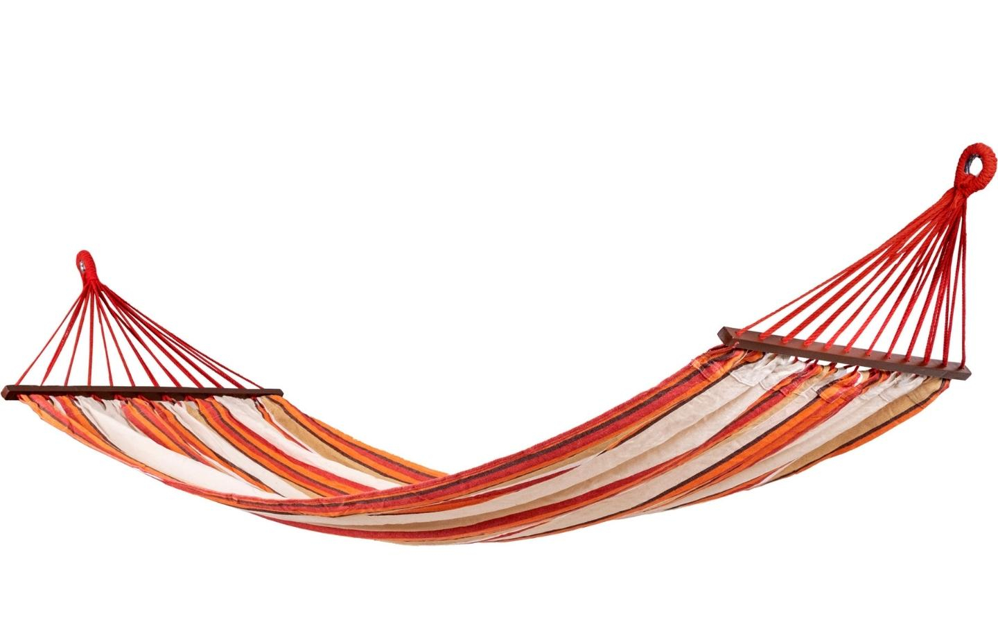 Comfortable hammock with wood spreader bar, which prevents the fold-back of the hammock fabric.