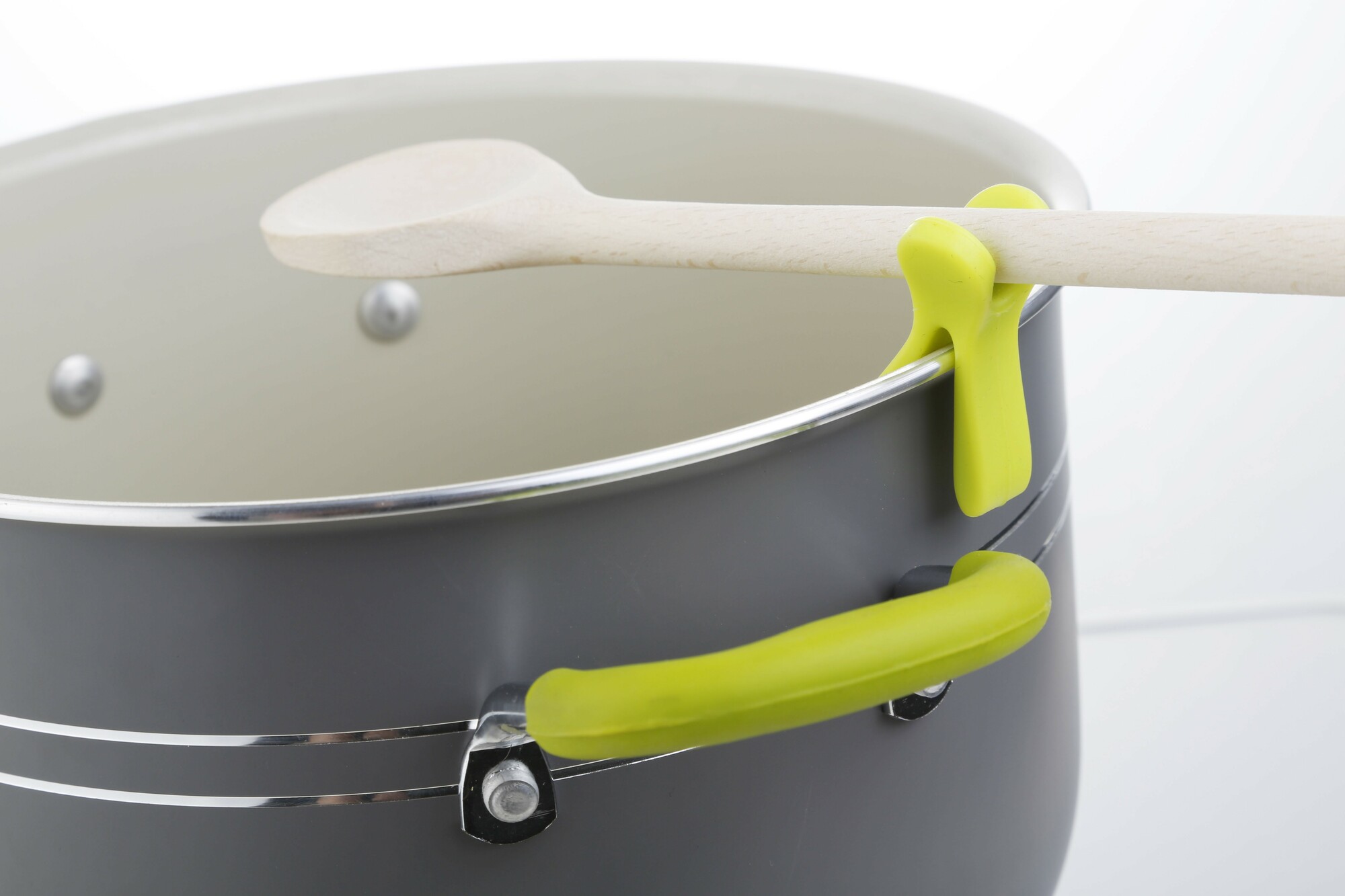 Spoon holder made of silicone. Very useful accessory. Ready for use by simply plugging in the pot edge. Set of 2.