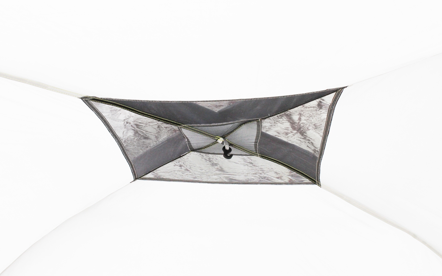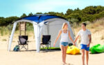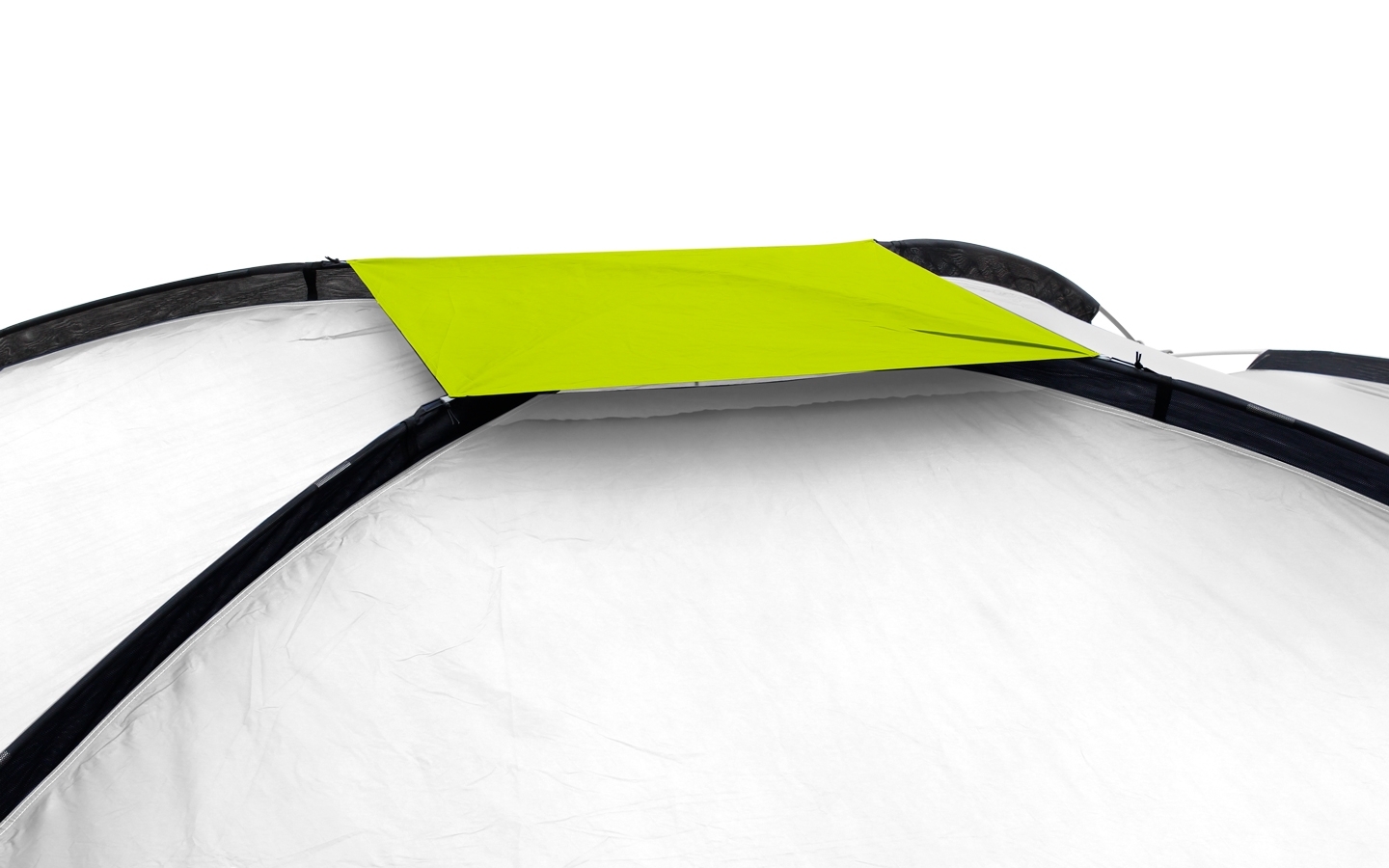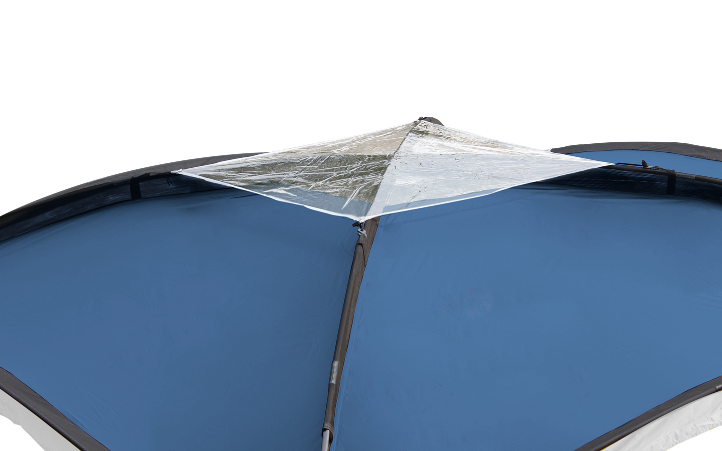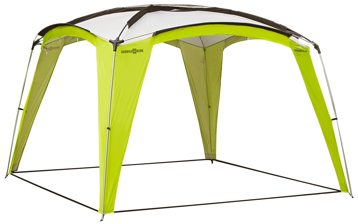 Outdoor gazebo with external poles made from steel and fiberglass. Eay to build up. Lightweight. Included two detachable polyester side walls.