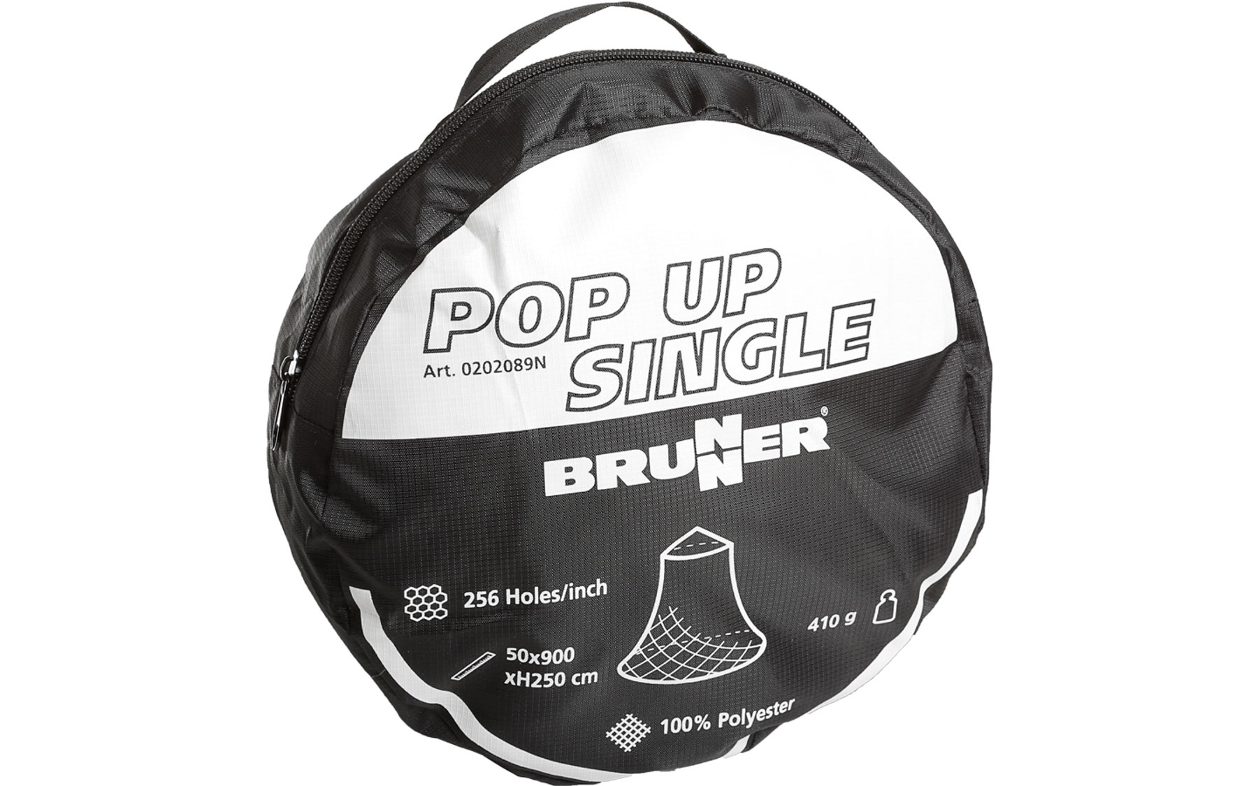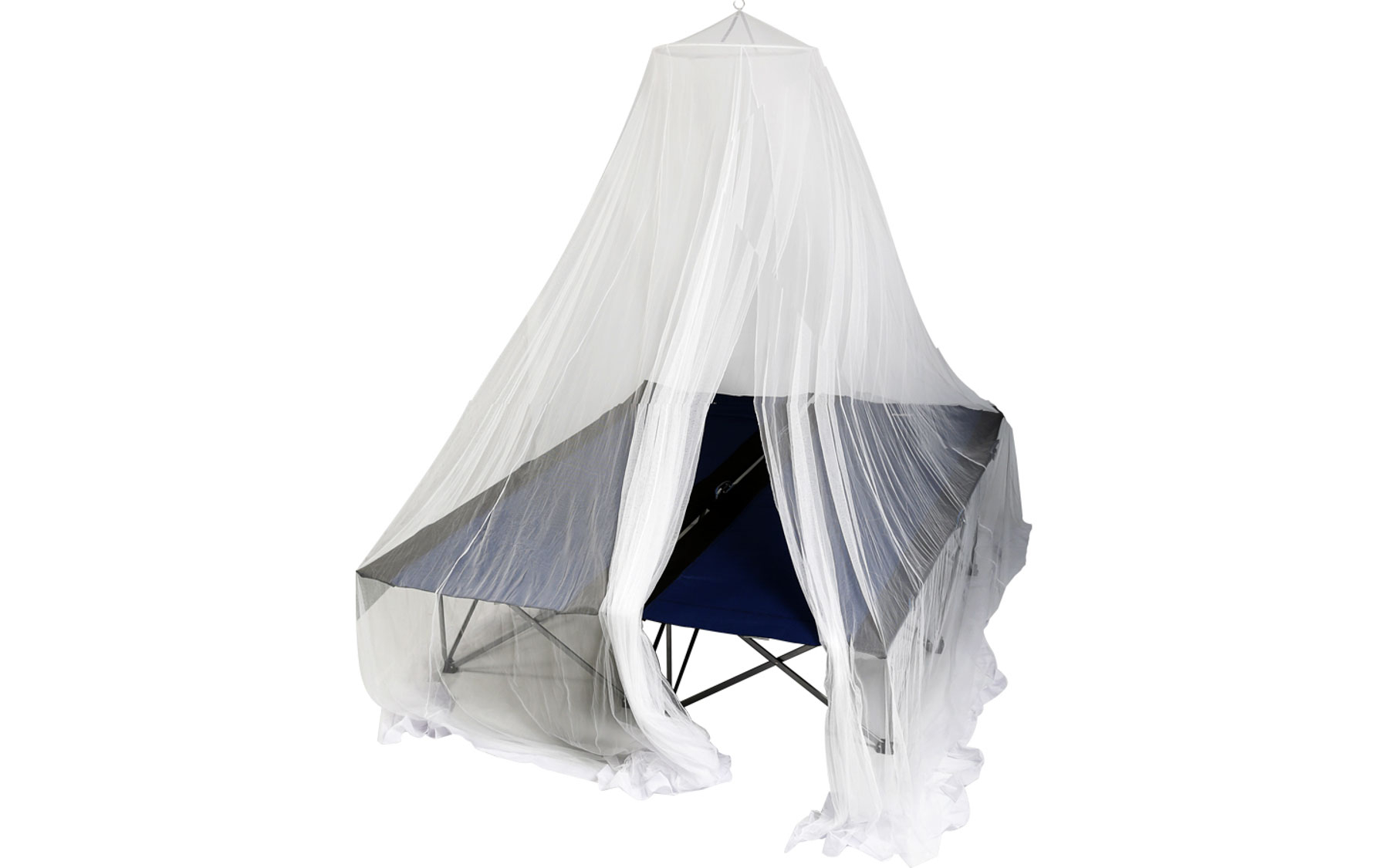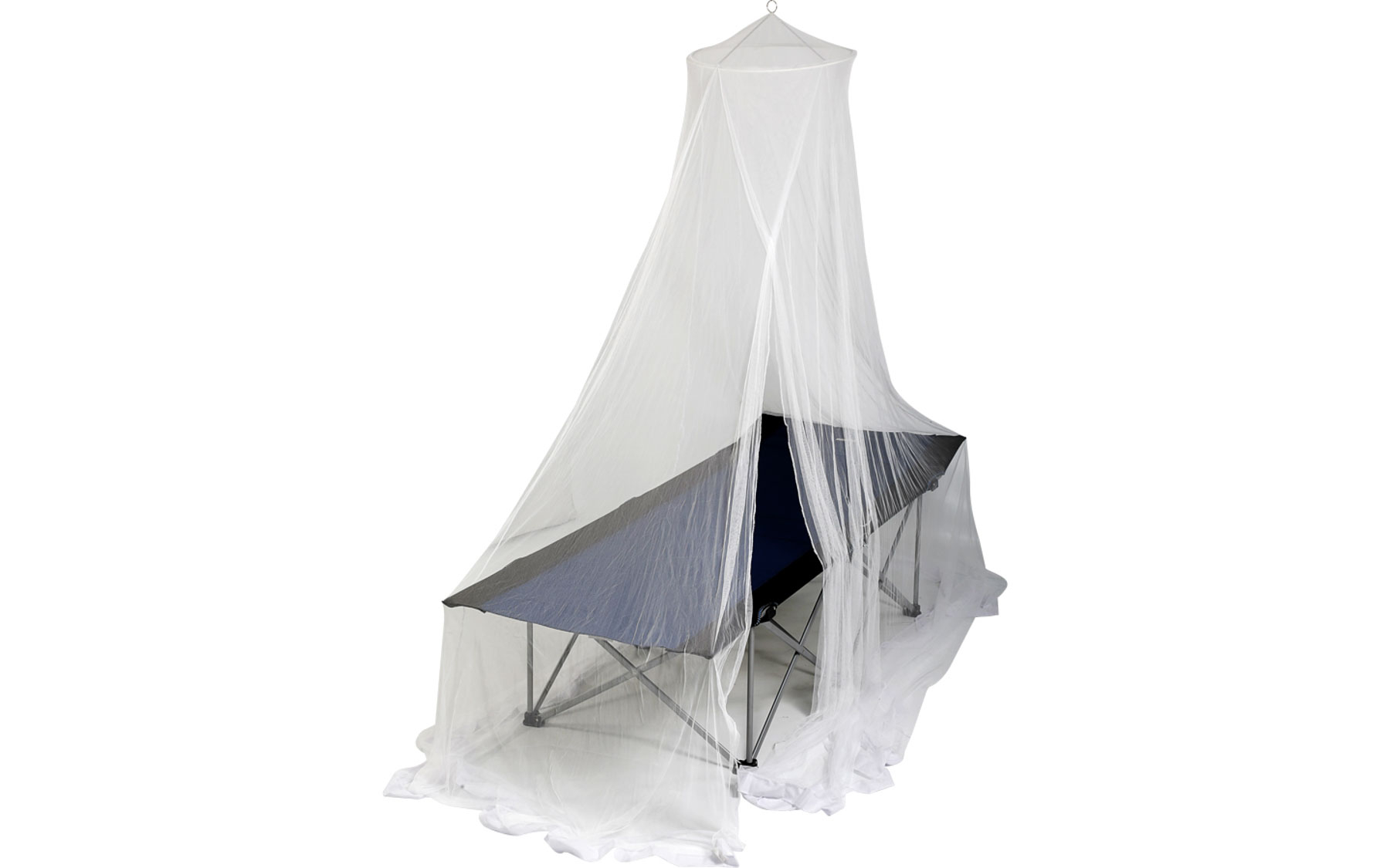 Mosquito net with automatically unfolding tension ring and carry bag. Compact packing size.