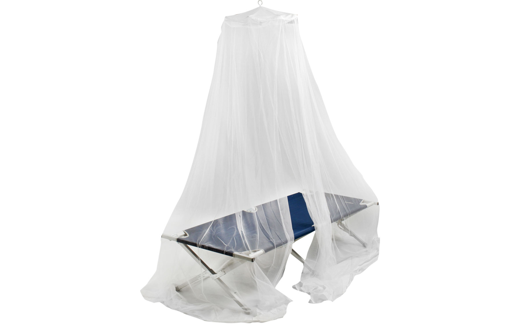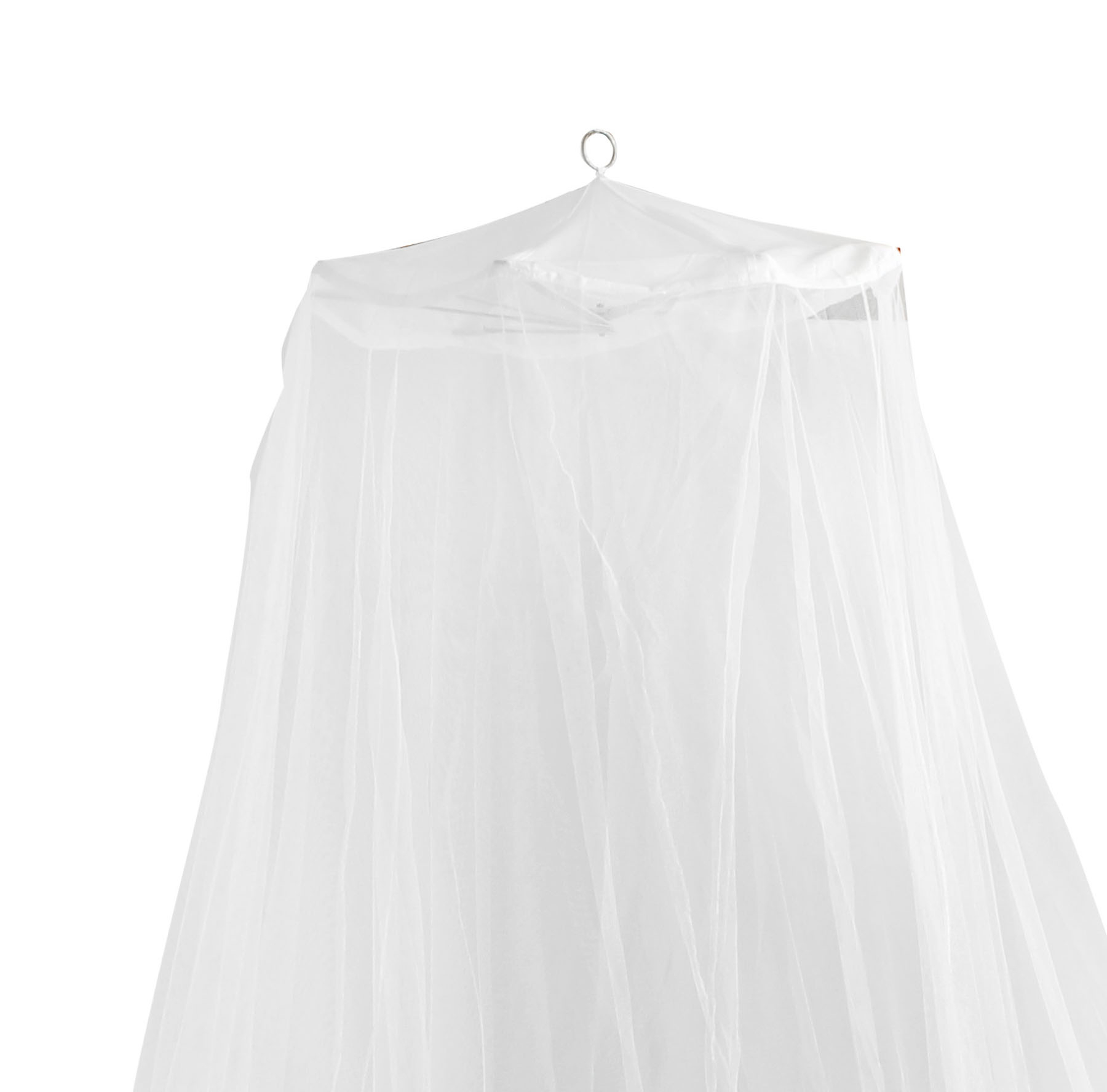 Mosquito net with tension ring and carry bag. Fits a double bed. Compact packing size.
