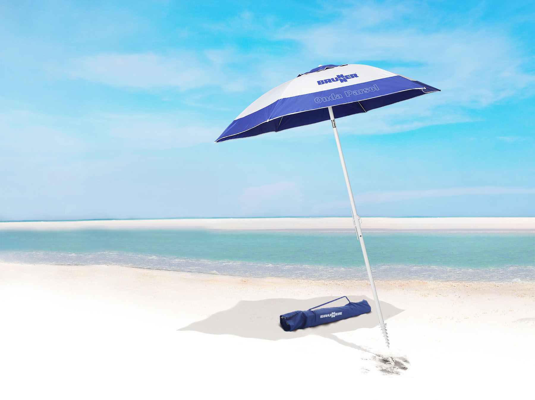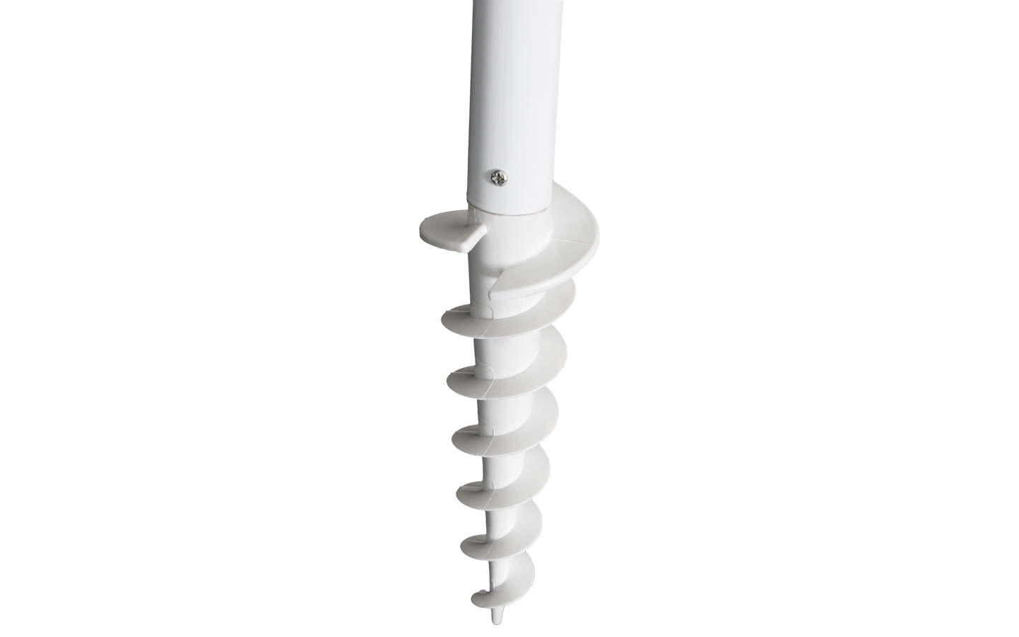 Modern beach parasol made of durable polyester fabric with 6 sturdy spokes. Strong Ø 32 mm shaft made from powder coated steel. Comes with aluminium tilt and a convenient screw-in bolt for sandy soils. Very stable in the wind thanks to its vented roof. With carry bag.