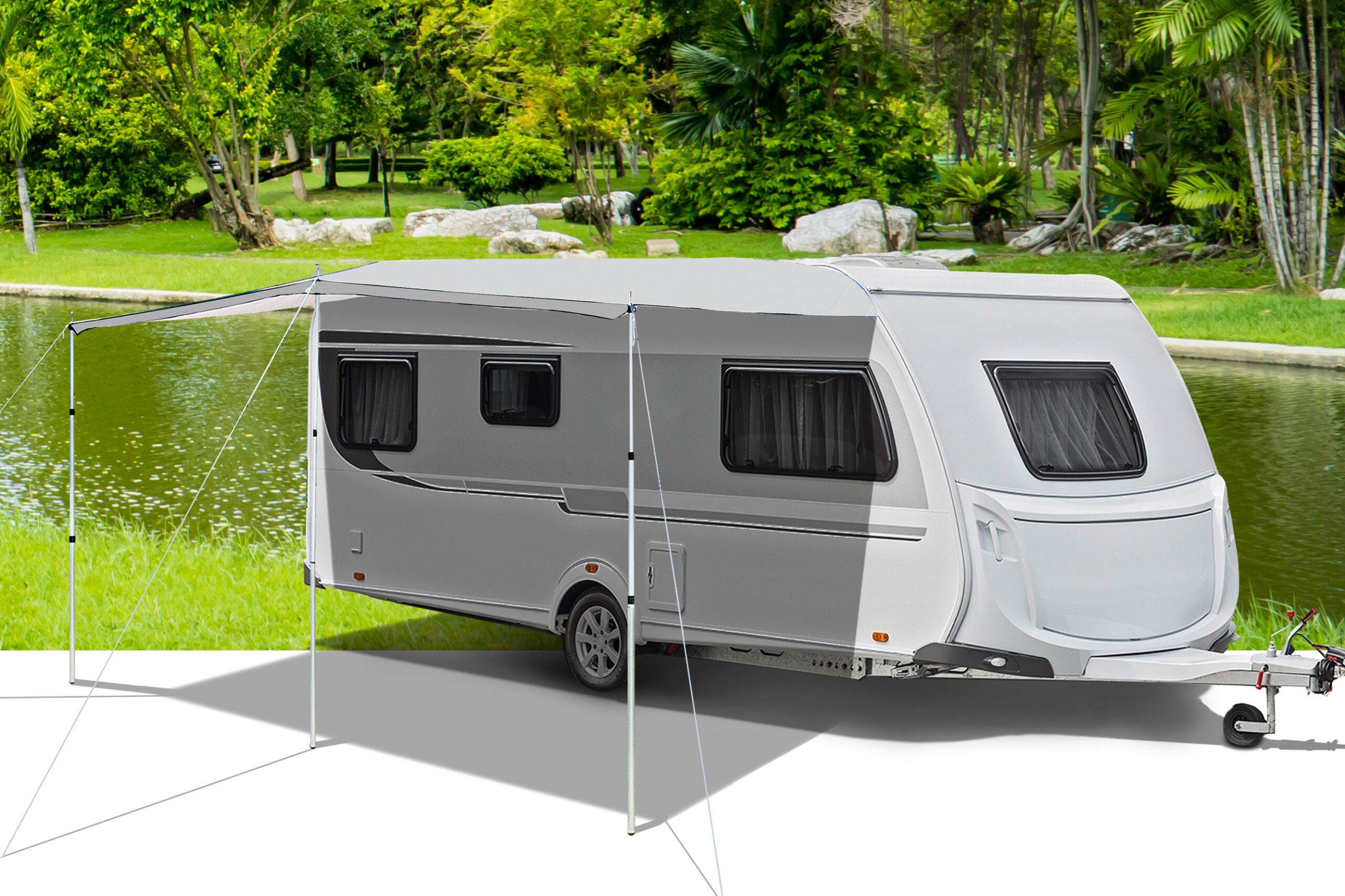 Classical caravan sunroof with reinforced plastic trim. Comes with height adjustable vertical poles.