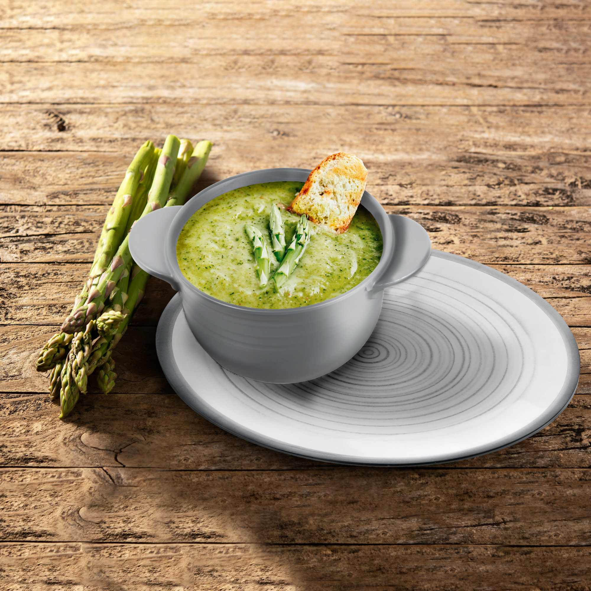 Elegant bouillon bowl for the classic hors d’oeuvre soups, clear broths and consommés, as well as for all main course soups. This high quality Stonetouch melamine dish keeps the temperature high for a long time and guarantees a maximum soup experience. With matching saucer.