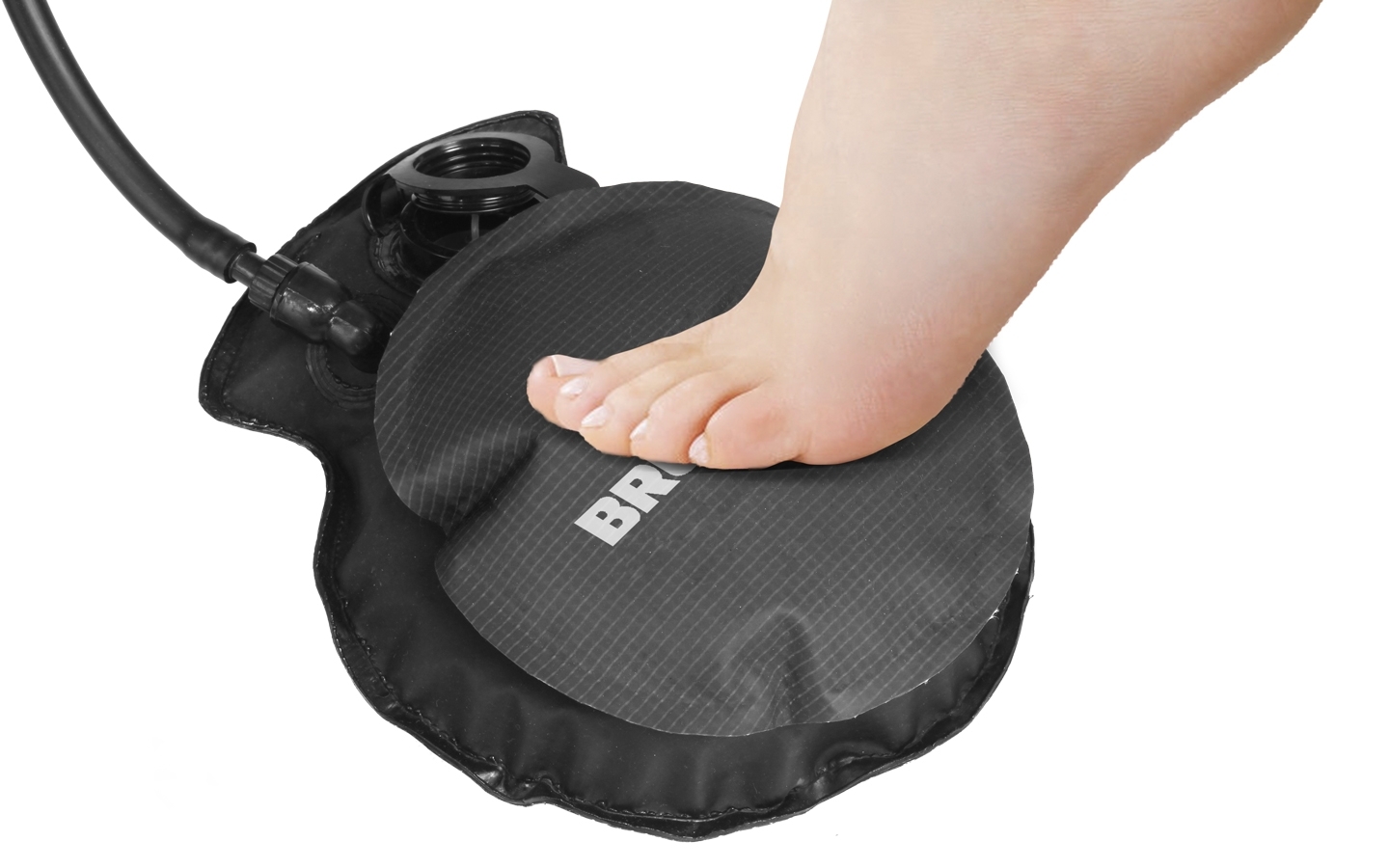 The Splash shower utilizes a manual foot pump to generate consistent water pressure, delivering a steady flow without the need for batteries or electricity. This eco-friendly design offers reliability in various outdoor settings.
