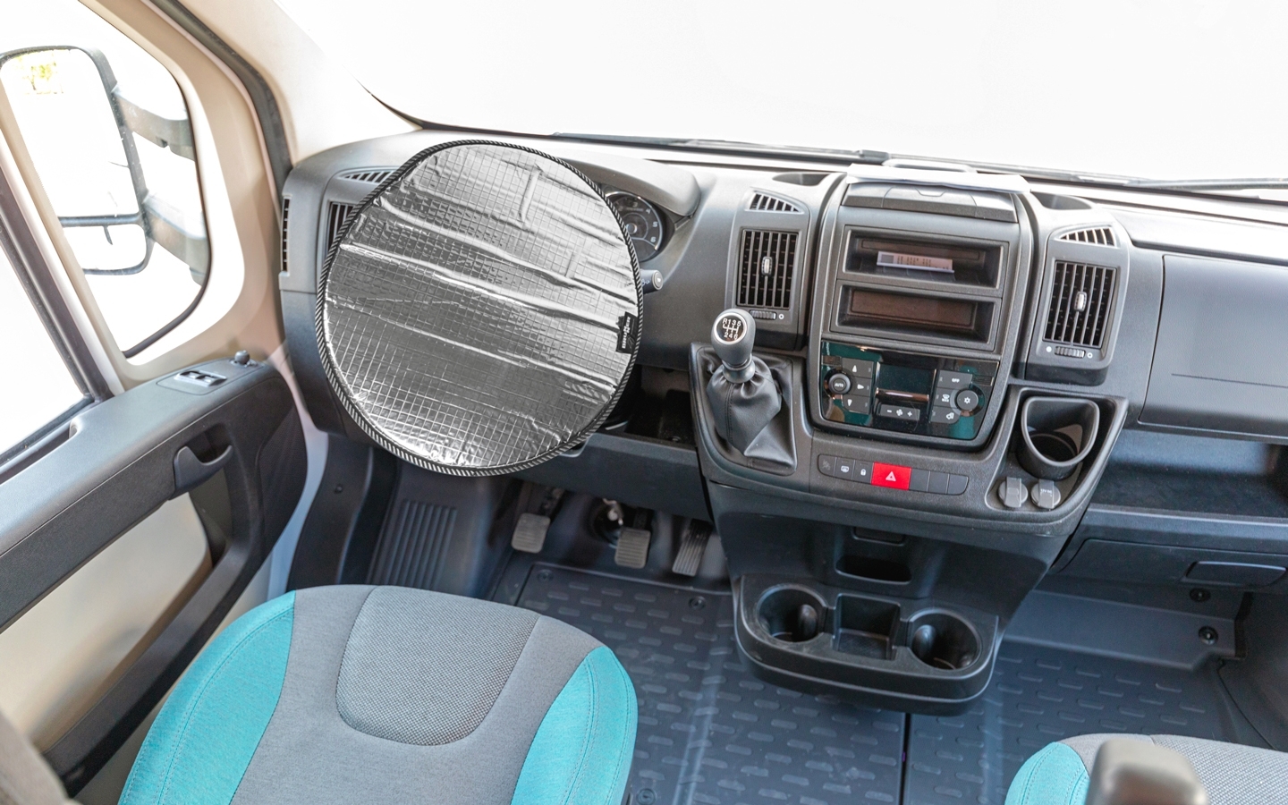 Steering wheel cover made of heat-reflective material. Ideal for protecting your hands and steering wheel from high temperatures. Very quick to mount. Suitable for all standard steering wheel sizes.