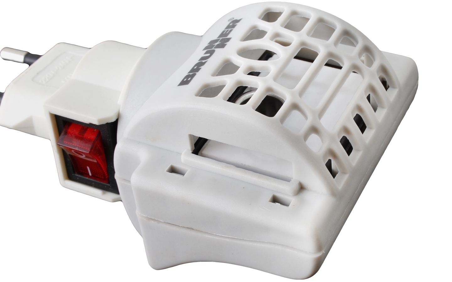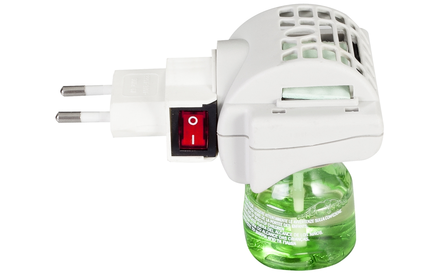 Electric mosquito killer with a double configuration based on repelling insects and mosquitos with a liquid essence or alternatively with an impregnated car pad. With rotating plug and ON/OFF switch. Liquid not included.