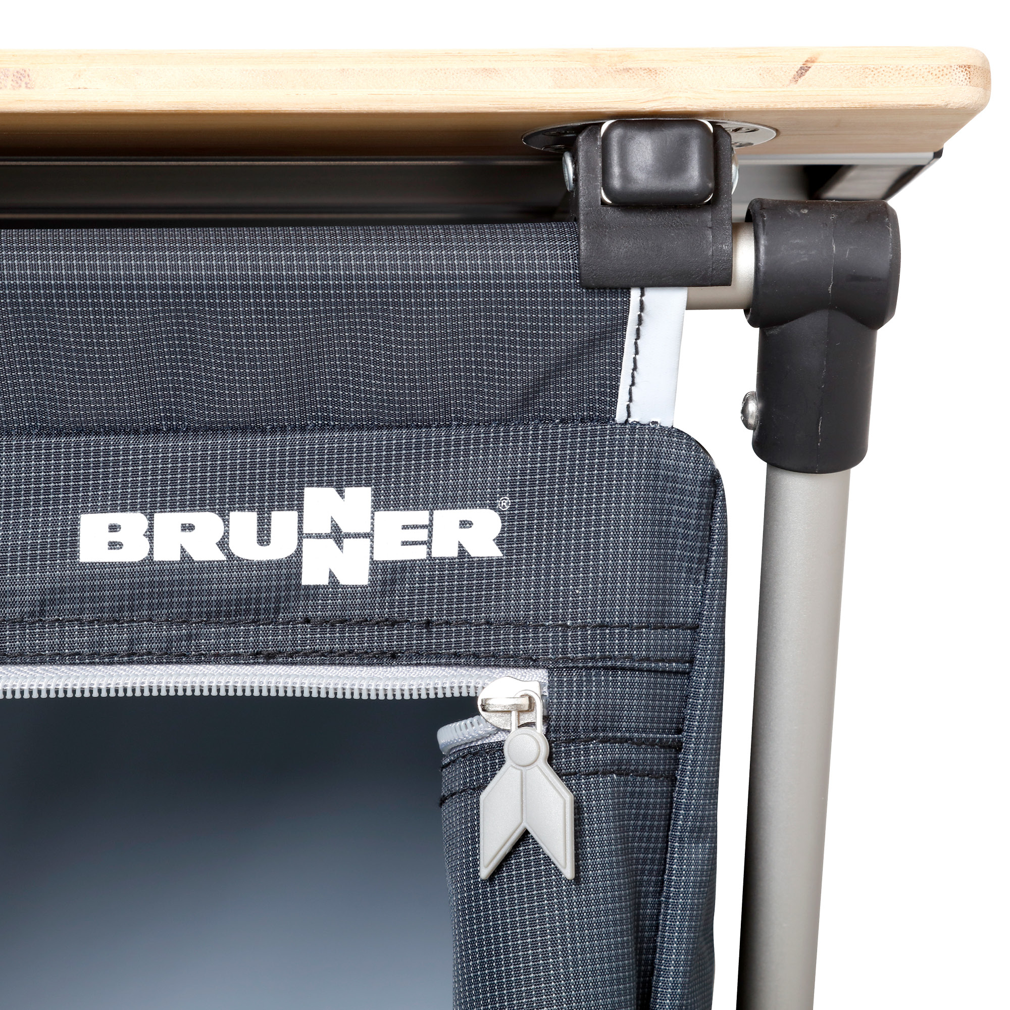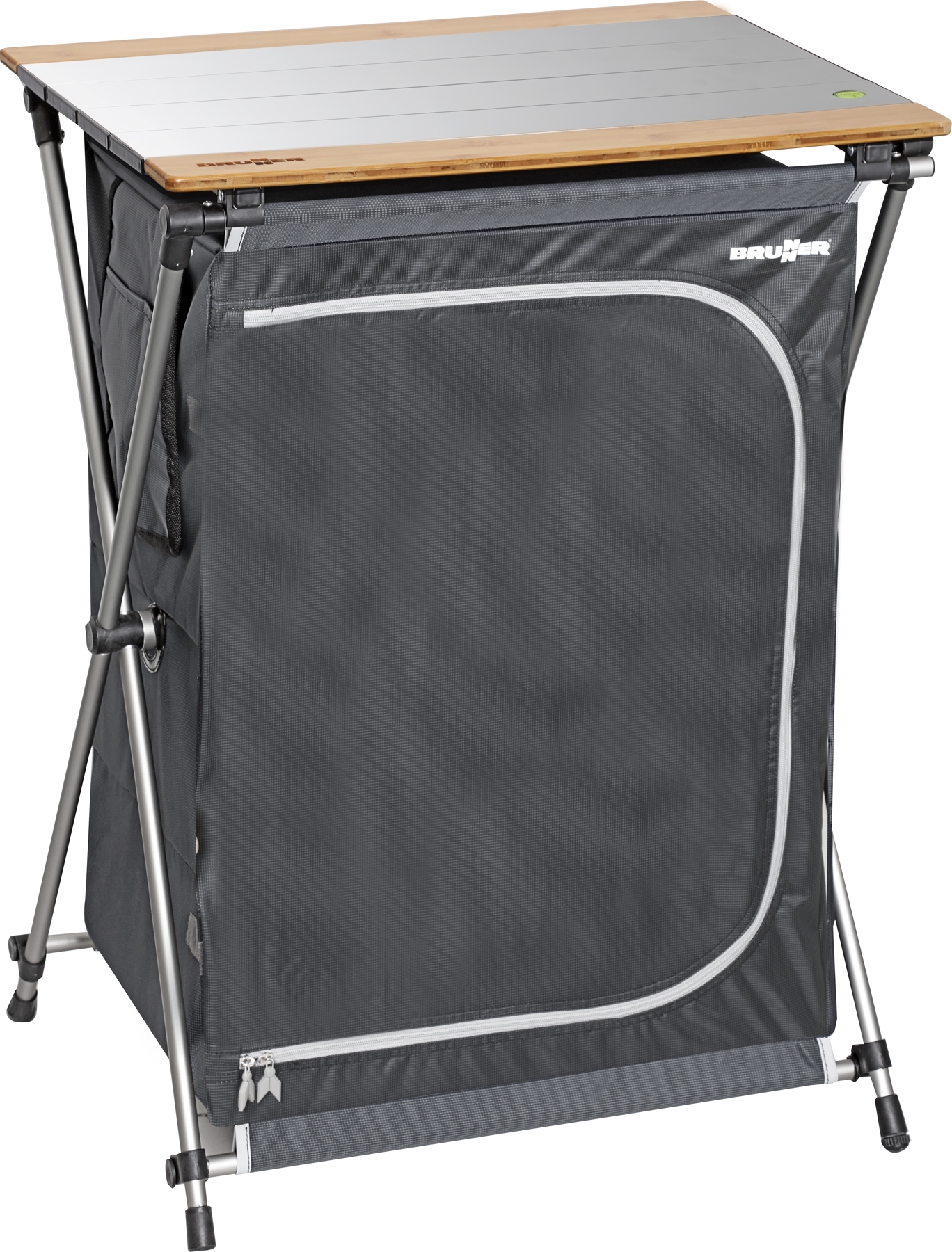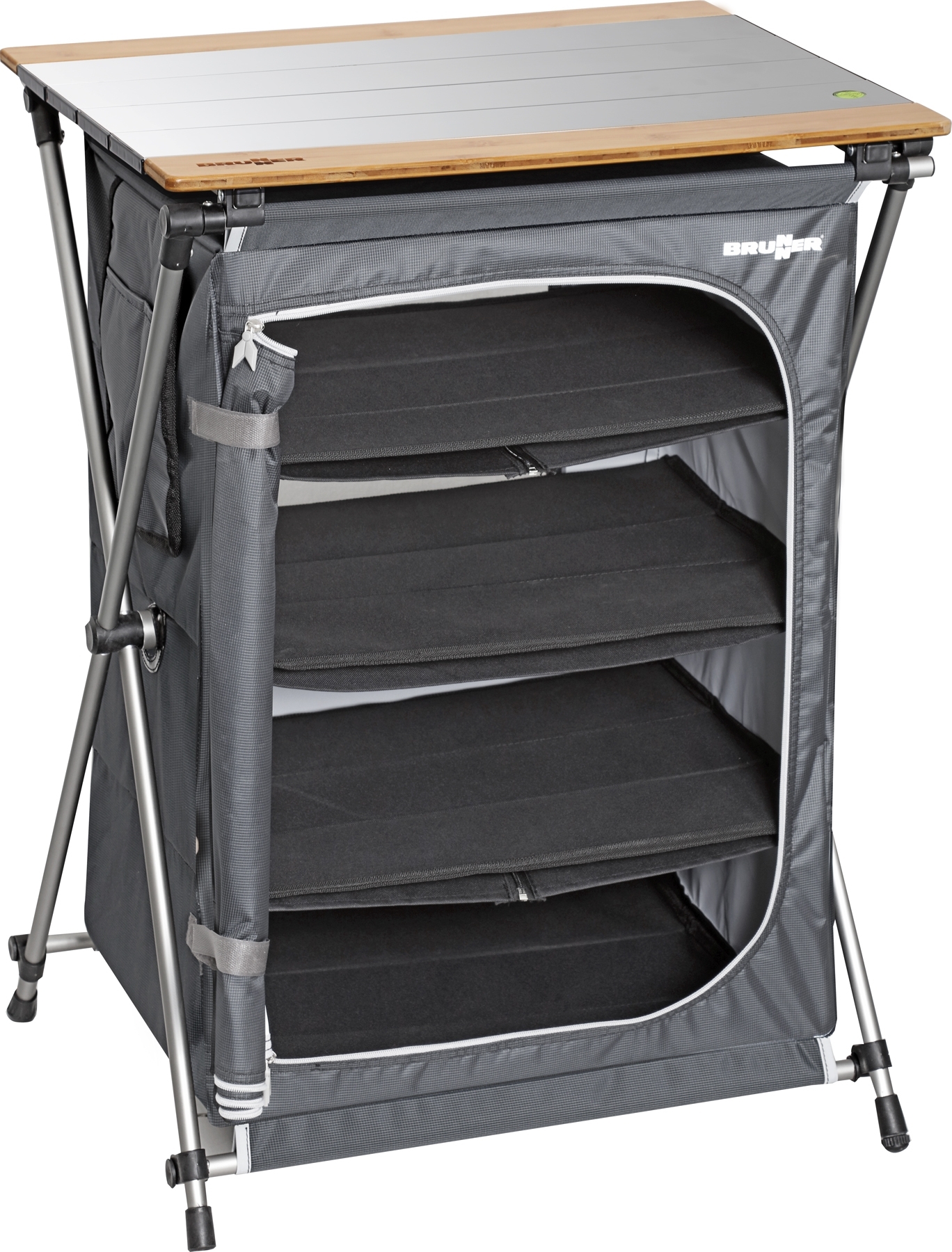 Ultralight outdoor multifunctional cabinet with sturdy aluminium plug-in frame. Simple, intuitive assembly and disassembly. Elegant, rollable aluminium cover plate with bamboo end slats. The spacious cabinet with 4 shelves and light-coloured interior coating offers plenty of storage space for all kinds of camper life items. All 4 legs are height adjustable.